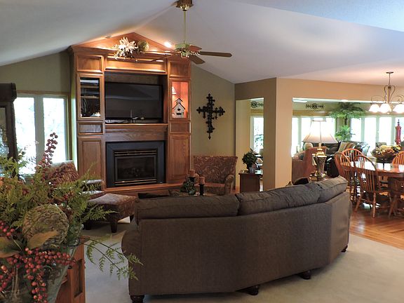 Do not miss out on this fabulous ranch home which sits on 1.76 acres, pond and 4 car garage. The garage is heated and air conditioned and would accommodate a boat, work shop, etc. The lovely home has hardwood floors, open concept, two eating areas and a main floor family room, which was an addition. What a wonderful home to entertain your family and friends! Granite kitchen, island and abundance of cabinets for kitchen storage. The main floor laundry has a sink and a separate half bath for convenience from the garage. What a breath taking view from the main floor family room with an abundance of windows to enjoy the foliage and pond, so private. The basement offers a Hugh rec room with a wet bar and plenty of room to add a wall on the south end of the room to be an office or 4th bedroom. (per plan) and this basement also offers a 3rd full bathroom. The walkout basement offers an enclosed large atrium/sun room with windows and walk out to the backyard. Two fireplaces, one on the main floor and one in the basement. Great for those cold nights and what a beautiful sight during those snowy days & nights for viewing, of the foliage and pond! Home shows pride of ownership and such a beautiful lot. The storage room is large enough to add a daylight window for a bedroom if needed. With this price seller will add a daylight window. All new low E windows, yard has its own well, separate one for drinking, house is zoned with hi-efficiency lennox equipment. Wood burning fireplace in basement with a blower, gas stove fireplace in the living room with remote control, walk out sun room for plants, osmosis water system at kitchen sink, and the rock water fall, ornamental and electric remain with the property. A must see home!