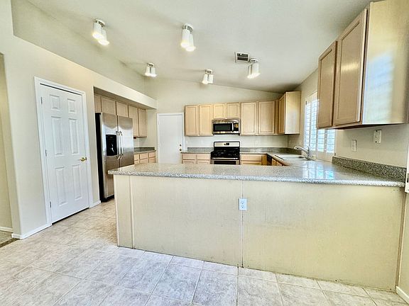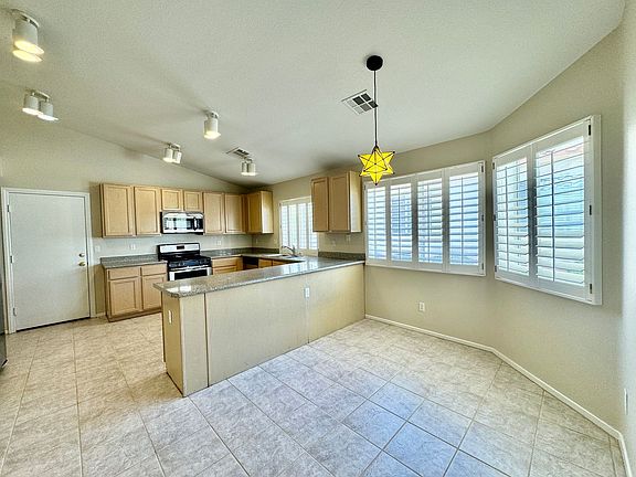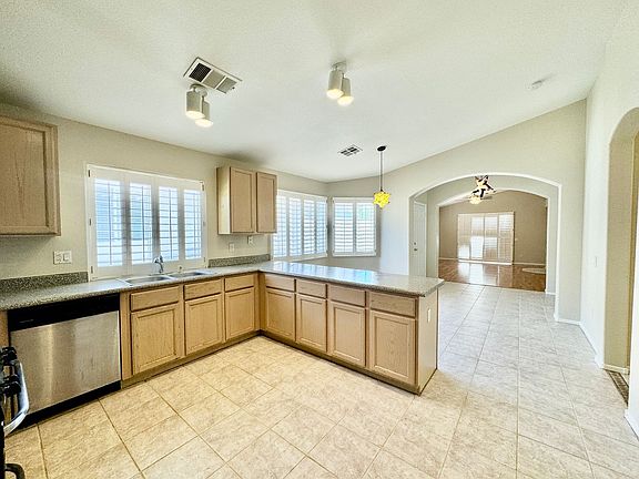 Freshly painted and full of charm, this home offers a bright and airy open floor plan that feels exceptionally spacious. The large kitchen features beautiful tile flooring and upgraded appliances, perfect for culinary enthusiasts. Relax in the cozy living room with a welcoming fireplace and vaulted ceilings, complemented by stylish wood-like floors. The primary suite is thoughtfully separated from the secondary bedrooms for added privacy. Plantation shutters throughout add a touch of elegance. Outside, enjoy a fully enclosed backyard with a covered patio and low-maintenance turf, ideal for outdoor relaxation.