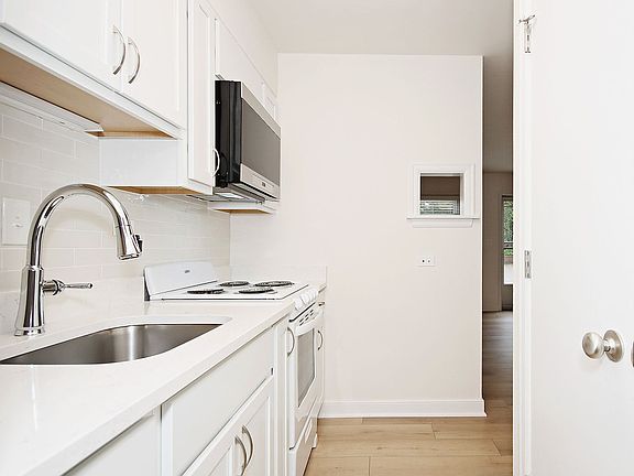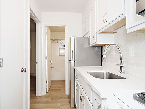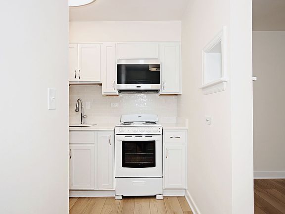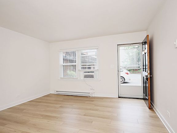 The 500 sqft ground level apartment features recently installed luxury vinyl plank flooring throughout, a living room, a kitchen with updated appliances, quartz counters, and a tile backsplash, a large bedroom with closet space, and an updated bathroom. One window ac unit is included.