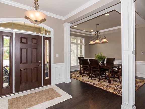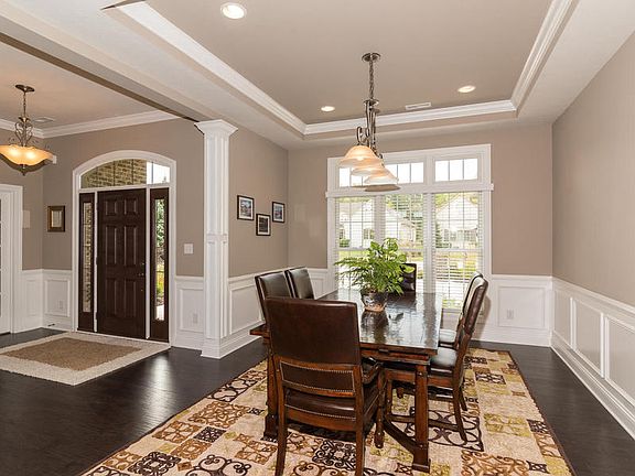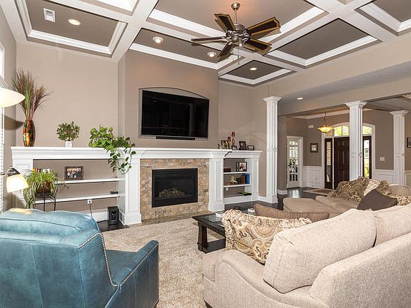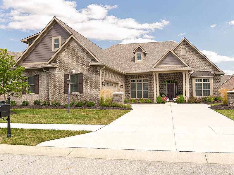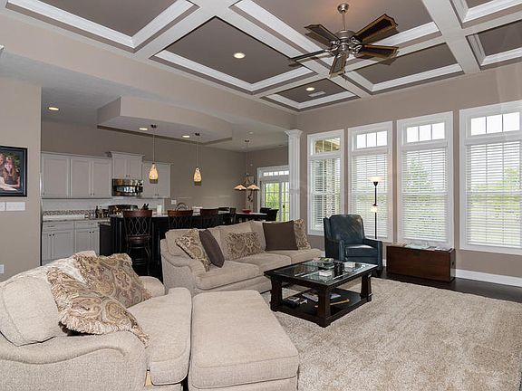 Custom all brick home with a large, open floor plan. Granite counter tops hardwood floors, raised coffered ceilings and tons of crown molding. This property is maintenance free, as all mowing and snow removal is provided by the HOA. Directly out the back door of this wonderful home is a large community space that includes walking trails and a golf area for chipping and putting.