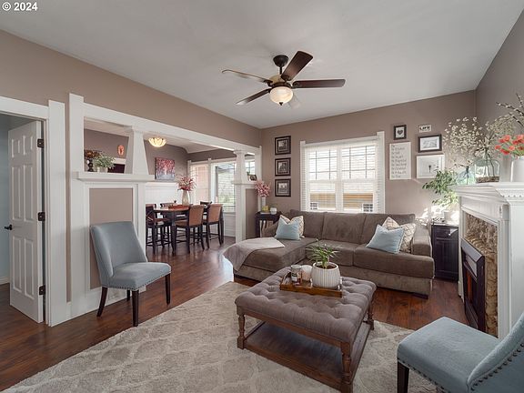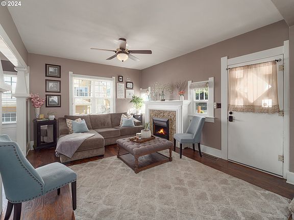 Too special to pass by! An enchanting home that combines vintage charm with modern comfort. Copy link: https://vimeo.com/923782380?share=copy to view walkthrough tour, push play & expand for full screen. Sitting on .28 of an acre with valley views, trees and the sound of the creek nearby. Offering a spacious fenced backyard filled with fruit trees, raspberries, blueberries & a strawberry patch. In ground sprinklers, garden beds and 2 storage sheds. 5 bedrooms, 2.5 baths, 11x9 bonus room and a 18x11 media room/living area downstairs. Spacious primary bedroom with large walk in closet and attached bathroom on the main floor that includes both a walk in shower and jetted tub. An attached 8x5 nook to the kitchen that has multi use (currently an office space). All stainless steel appliances throughout the kitchen. The newly remodeled 1/2 guest bathroom is on the main floor along with the laundry. 3 bedrooms and a full bathroom with newly installed floor tile and double sink vanity is arranged upstairs. Hidden beneath the carpet upstairs you'll find a pleasant surprise of the original hardwood floors. Downstairs you?ll find 1 bedroom, an extra bonus room and a media room that connects to the usable 19x11 basement space. Smaller 11x9 storage/workspace connected to basement area. Don't miss the original gorgeous built-ins for extra storage throughout the home. AC for the hot summer days and cozy up to your electric fireplace during our chilly months.