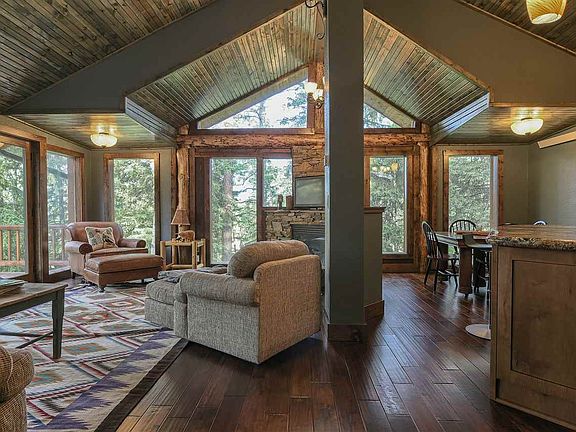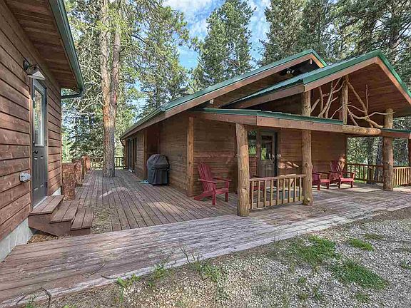 Charming 1886+ sqft. cabin with an ideal location near local snowmobiling, outdoor recreation, and just a few blocks from Terry Peak Ski Resort. This cabin has many recent updates, plus you'll enjoy the oversized single car garage that was added in 2015. Inside, entertain guests from the kitchen equipped with appliances, granite countertops, a bar counter brightened by glass pendant lights, and hardwood flooring. The dining area & living room have a vault ceiling and large windows that frame the wooded views, plus a gas fireplace with stacked rock accents, and garden doors that step out to the covered deck. The bedrooms are carpeted and the bathroom updates include travertine tile. A log ladder leads from the main floor to the cozy sleeping loft.