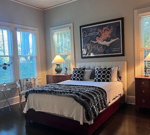 Thoroughly updated and beautifully staged, this 4 or 5 bedroom home in the prime section of Alexandria's historic district on a charming brick street will capture and captivate your heart and soul. From the soaring ceilings, many to 11 feet, to the multiple porches inviting rest and relaxation, this sizeable property renovated in 2013-2014 is set on a picturesque landscaped corner lot. The home offers 3500 plus heated and cooled square feet and a floor plan that can be utilized in plethora of ways. A fully fenced backyard, colorful flower beds in front and a shady hidden side yard graced by rows of towering Japanese maples and wrought iron benches add to the outdoor appeal. The interior floor plan includes oversized living room with wood burning fireplace, formal dining room, informal breakfast area adjoining the showcase kitchen, indoor front porch or small den, screened back porch, separate office and 2 or 3 bedrooms downstairs (one is currently used as a TV/media room), 2.5 baths down and 4th bedroom with stunning bath and sitting room upstairs. Whether you desire to "nest" with a good book and cup of coffee or invite your many friends over for a gourmet meal, this sweet spot will accommodate whatever the moment holds. Amenities include Carrara marble countertops in kitchen and baths, hardwood floors, eclectic light fixtures including many recessed lights, stainless appliances, all new double pane windows, avant-garde ceiling fans, 3 central air and heating systems, double hot water heaters, irrigation system in back yard (almost perfect grass here!) and MORE! A two car garage at the end of the driveway includes an attached workshop/shed area which has plumbing for a toilet and could be upgraded into an outdoor kitchen or bath. The grand wall space in every room will attract your cherished fine art. Also included!: 5 security cameras, plenty of parking, gate across driveway that could be converted to security gate and wonderful neighbors!
