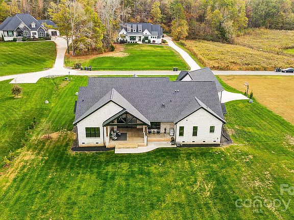 This stunning modern farmhouse on 6 acres is sure to impress! Step into the grand foyer with soaring 17' ceilings, leading to a private office and formal dining room. The open-concept great room features 14' ceilings, a gas fireplace, and custom built-ins, perfect for entertaining. The chef's kitchen is a showstopper with a 10' quartz island, oversized butler's pantry, and Thermador smart appliances, including a panel-ready refrigerator and dishwasher, 4' gas range with pot filler, and dual oven/microwave. The luxurious primary suite offers direct access to the outdoor living area, while the spa-like bathroom features a wet room with soaking tub, showerheads for two, and a spacious walk-in closet. Outside, enjoy privacy and ample space for a pool, with a covered porch ideal for gatherings. Don’t miss the renderings showcasing the possibilities for this incredible backyard. There is the potential to add 400sf of HLA by finishing the room over the garage. NO HOA!!!