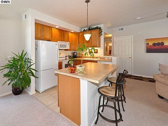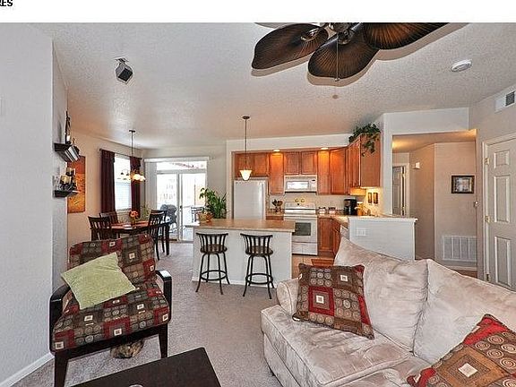 Beautiful Centerra 2 bed, 2 bath condo on the greenbelt. Lovingly cared for by one owner. Surround sound speakers, tiled Kitchen and baths, 42" upper kitchen cabinets with island and fenced area plus balcony overlooking greenbelt. 1 car garage close by. All kitchen appliances stay and garage has storage shelving.