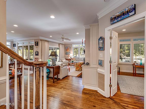 You'll find hardwood floors & nine-foot ceilings throughout. The open & spacious floor plan encompasses the kitchen, living & dining areas. Just off the living area(with gas fireplace!) there is a true four-season glassed -in porch overlooking the water and meticulous landscaping. Many upgrades have been done including new kitchen appliances and bathrooms. Principle bedroom is on the first floor, with three spacious bedrooms, two full baths and a reading loft on the second floor. Additionally, there is a flex room above the garage (frog) with built-in desk and cabinetry, along with its own full bath and walk-in closet! Generous closets and storage throughout. This home has a deck along with tons of seating along the water. There is a private dock where there is a private dock to keep a boat and launch kayaks at water level.