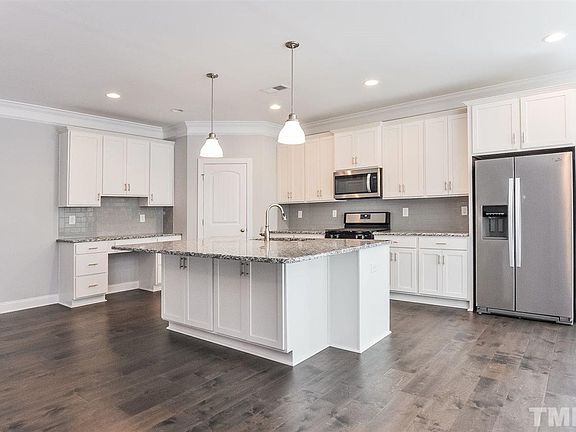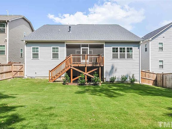 Built in 2017, this Fuquay Varina two-story offers a deck, a fireplace, granite kitchen countertops, and a two-car garage.