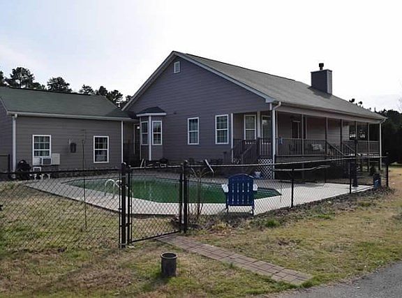Bring the animals! Custom-built, country home on 5+ acres. Home sits back off road. Master suite with garden tub/sep shower. Rocking chair front porch, hardwood floors, huge pantry, four car garage/workshop. Beautiful in-ground pool. Detached garage that could easily be finished for teen/in-law suite. Fenced pasture. Very private! Must see!