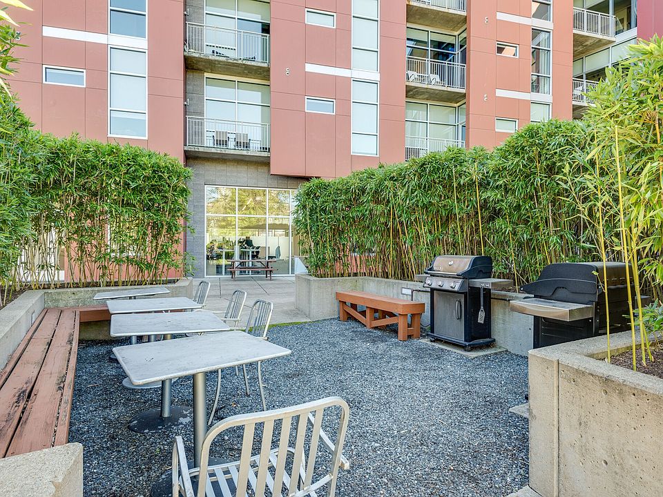 Beautiful open-concept condo located at the 5th & Main building! Good size kitchen includes tons of cabinet space and stainless steel appliances. The bartop with seating provides an eat-in dining space and opens to the living area, perfect for entertaining. The condo is flooded with natural light through large windows, and the seller has blackout curtains installed in the living room and bedroom. The primary bedroom overlooks the patio and features an en-suite bathroom including modern vanity and a tile shower. This unit includes 1 deeded parking space, a storage unit (6 x 3' 9"), and an in-unit washer and dryer. You will love being within walking distance of downtown Nashville, restaurants, and shopping.