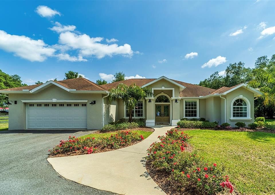 Perfect opportunity to own a fully finished equestrian facility! This 10 acre farm is ideal for the avid equestrian looking to set their roots in the Ocala area! Just under 20 minutes to the World Equestrian Center and 8 minutes to HITS! No detail was overlooked at this location! As you enter through the gated entry, you will arrive to the 3 bedroom ; 2 bathroom pool home. Upon entering the home, you will be greeted by an open floor plan boasting high ceilings in the main living space, wood look tile floors, and large sliding doors leading to the pool area. The kitchen features quartz countertops, two tone wood soft close cabinetry, marble back splash, and stainless steel appliances by Kenmore, Bosch, and Verona. The spacious primary bedroom has beautiful views of the heated salt water pool and paddocks from the back windows and sliding doors. The primary bathroom features hexagon tile floors, walk-through closets, toilet closet, glass shower, soaking tub, and dual sinks. The remaining bedrooms have lovely views of the front paddocks and share the second bathroom that leads to the pool. The home is fenced with 3 board fencing and is wired with no climb, ideal for your pets so they stay within your homes perimeter. The farm is an equestrians dream! The separate barn driveway leads you to the concrete block barn The barn comes complete with: 27 stalls that are 12x12 in size, newly installed fly spray system, 4 hot & cold wash racks, tack room with brand new smart washer & dryer, and barn half bath. The barn also features a 2 bed ; 1 bath barn apartment with recently renovated bathroom. Other farm amenities include: two brand new 2 stall shed rows with storage bays (all 12x12 in size), irrigated silica sand riding arena, grass riding field, 8 paddocks, 6 horse eurocizer, 3 RV hookups (two 50 amps & one 30 amp), freshly planted landscaping (fully irrigated), and 3 board fencing. The HOA community offers riding trails that lead to the centrally located community track! This property is a true gem and is perfectly set up for any equestrian to walk in and start their barn or business!