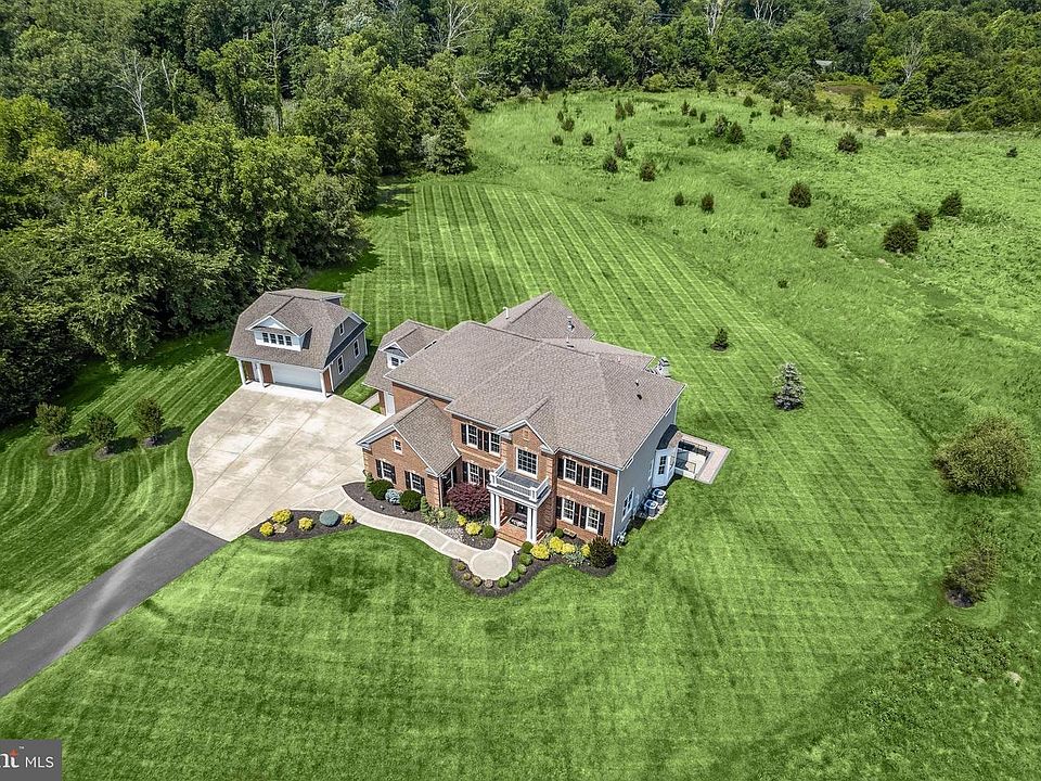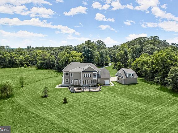 A truly rare opportunity in Leesburg, VA with 32 rolling acres, a glistening pond, and a gorgeous residence located just minutes from parks, hiking, wineries, breweries, farms, shopping, entertainment, hip restaurants, and great schools. The HOA allows the property to add barns, stables & guest house. A quintessential board fence and a pair of stone pillars are capped with lantern lighting and announce entry to a private drive that leads to this very special property. There is abundant parking, and a secondary entry allows quick access through the mud room outfitted with arrival cubby storage, bench, and closet. From the outside portico, an eight-foot door with leaded glass sidelights will draw guests into a dramatic two-story entry foyer and open stair that is embellished with iron balusters, accent panel moldings, and multi-piece crown moldings. Pristine finishes and hardwood floors are a unifying element throughout the main level beginning with living and dining formals that flank the entry foyer with generous openings, engaged columns, and wainscoting. The open plan design seamlessly unfolds from the foyer into the central family room defined by a grand coffered ceiling and a gas fireplace with a striking hearth and stone surround on the main axis. Quality woodwork, meticulous details, and fine finishes are standard throughout this impeccable home. The spacious kitchen is adjacent to the family room and is separated by a half wall and engaged columns that are repeated from the living and dining rooms. It is encircled by the back stair, mud room, laundry center, breakfast room, and dining patio. A commanding island and cook station with a designer pendant is open to the sink peninsula that overlooks the breakfast room and large windows that frame panoramic views of the grounds and trees beyond the expansive paver dining patio, outdoor fireplace, center fire pit and garden bench walls. Completing the main level is a private study enclosed with glazed French doors, and wrapped in windows that also frame views of the same panoramic vista. Upstairs, the main house offers an extraordinary primary owner's suite that includes a light-filled sitting room outfitted with a gas fireplace, wet bar, and beverage center on one side, and an atrium door to a private balcony on the opposite side. The primary bath offers an extended double vanity with a white stone top, furniture-styled bun feet, and a soaking tub with a white marble surround. Adjacent to the tub is an oversized walk-in shower with designer tile, body sprays, a handheld spray, and a shower with remote control on the wall. The owner's suite bath leads into a two-room walk-in closet that will generously accommodate two wardrobes and a dressing area bathed in light from a daylight window. The upper-level sleeping quarters total five bedrooms including two ensuite bedrooms and two additional bedrooms with a shared Jack and Jill bath. Downstairs, a fully finished lower level offers daylight from a pair of double atrium doors from the side lawn, leading into a recreation room, and billiards area, a full wet bar with a built-in, lighted back bar, and media niche, an exercise room, storage room, and fifth ensuite bedroom, attached full bath and linen closet. The main house has two attached garages with three bays. One garage opens on two sides to accommodate tractor equipment. A detached garage offers two additional bays and a private entrance to the second-floor guest carriage house above. The guest suite is equipped with a light-filled living room, dining room, kitchenette, and full bath, all meticulously finished with the same level of quality as is standard for this immaculate residence. Every detail, large and small in this premiere property has been carefully curated and maintained with the utmost care. Come home to a like-new residence with plenty of room to live, work, play, and grow on 32 beautiful acres!