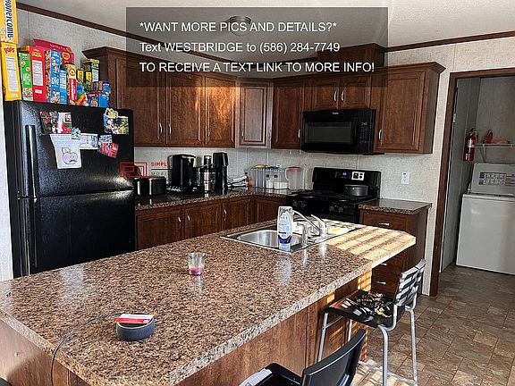 Like new, modern 4 bed 2 bath home situated on large lot with large backyard. Step inside this beautifully maintained home and fall in love with its open spaces, including a nice sized kitchen with island, his and her sinks in the master bath, walk in closets and more! Open layout with modern flooring. Roof (less than 2 years) a/c, furnace, hot water tank - all less than 6 years old! All appliances newer and are included (except washer and dryer) *AVAILABLE NOW* City: Macomb Park: Westbridge Lot rent: ~$560 (buyer to verify) Size: 28x56 (buyer to verify)