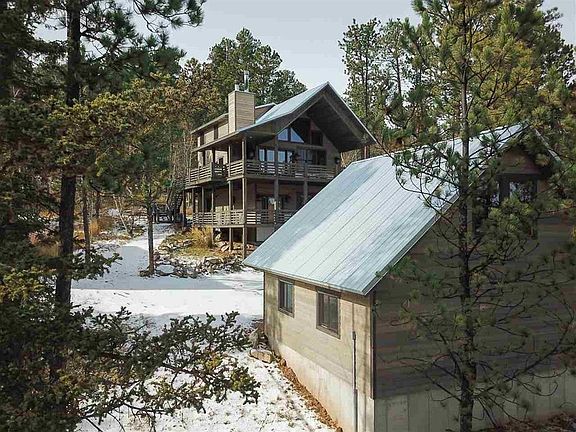 For more information, please contact listing agents Scot Munro 605-641-6482 with Great Peaks Realty or Ashley Goodrich 605-645-2479 with RE/MAX In The Hills. This 4 bed, 3 bath cabin located in Gilded Mountain is a must-see! Enjoy the stunning views from the two story covered, wrap around deck while drinking your morning coffee next to the outdoor rock fireplace. The heart of the cabin, the kitchen, featuring a large center island with a built in cutting board, giving plenty of space to cook your favorite meal, beautiful cabinetry, beverage refrigerator and commercial grade stainless steel appliances. The cozy living room offers vaulted ceilings, windows galore, and a rock fireplace to keep you warm. On the main level is also home to one bedroom & bathroom. The master ensuite is privately located on the upper level with a spacious walk in closet, a nice tiled shower and plenty of space for all your things. Step downstairs to the lower level right into the family room, great for movie nights, as well as the laundry room, two bedrooms and another bathroom. There is a detached 2 car garage with a bonus-loft that is insulated, equipped with mini-split, and cozy fresh carpet. (this sf is included in the Total SF) . Do not miss your chance, call now!