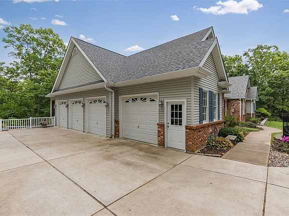 Stunning custom-built atrium ranch offers 3 beds, 3.5 baths & a spacious open floor plan with vaulted ceilings, wood & ceramic tile flooring, and abundant natural light. Brick front, circle drive, covered porch, and 4-car side-entry garage on the main level, plus a lower-level tuck-under "flex core panel garage" (meaning no posts) 2 car garage (with space for up to 4 tandem vehicles). Features include a formal dining room, gas fireplace, walk-in closets, vaulted & coffered ceilings, built-ins, cutouts, and recessed lighting. The kitchen offers breakfast bar, stainless appliances, dedicated pantry, and breakfast room overlooking the beautiful, wooded back yard. Step out to the screened, covered back porch for incredible views of this private lot, enjoy main floor laundry and divided bedroom floor plan. Primary bedroom suite has coffered ceiling, luxury bath with tub with separate shower. The walkout lower level offers a full bath, cozy living area with wood-burning fireplace, a large rec room with wet bar—perfect for entertaining or a pool table and or possible lower-level bedroom/living quarters for in-laws/adult kids. Tons of storage throughout in the unfinished space, workshop and additional garage are plumbed for another sink! This one-of-a-kind custom-built home has space, style, and flexibility—schedule your private tour today!