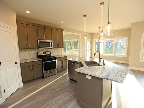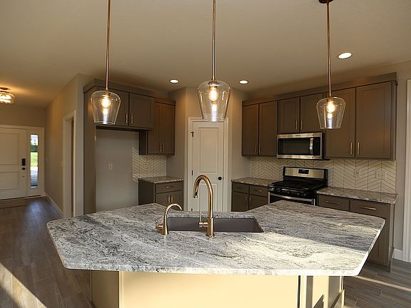 Beautiful new split bedroom ranch home under construction Southwest with a rear covered veranda. The craftsman exterior has a 6' deep front porch. Welcome guests in this beautiful foyer with a barn door accent. The great room has a corner gas fireplace with a stone surround. The kitchen has custom maple painted cabinetry with crown molding, island withbreakfast bar, granite countertops, 9' x 6' pantry, undermount sink, tile backsplash and stainless steel gas range, dishwasher and microwave. Just off the nook is a sunroom. The main bathroom has a larger tub/shower, linen closet and 3' vanity. At the opposite end of the home is the private owner's suite. This large room has a tray ceiling and large bathroom with a double sink vanity, 7'x4' porcelain tile shower, stool room and large closet. The laundry room has cabinetry for storage and folding. Other features of this home include: 9' ceilings, resilient plank flooring in the foyer, kitchen, nook, great room, sunroom and main bathroom, painted trim work,Andersen high performance windows and a large concrete patio.