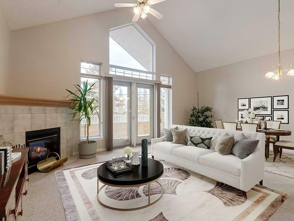 Welcome to Unit 2116 in Patterson Bluffs! This stunning TOP-FLOOR condo offers nearly 1,100 sq. ft. of thoughtfully designed living space in a sought-after 55+ adult only building. With soaring 14'8" vaulted ceilings and expansive Southwest-facing windows, natural light pours into the home, creating a bright and airy atmosphere. A rare find, this unit shares only ONE common wall and is uniquely positioned beside a staircase, providing extra privacy and convenient access if you prefer to skip the elevator. The spacious open-concept layout is perfect for entertaining or relaxing, starting with a well-appointed kitchen featuring ample storage, a large pantry (a rarity in condo living!), and a breakfast bar that seamlessly connects to the dining and living areas. The cozy gas fireplace enhances the inviting ambiance, while french doors lead to the impressive nearly 19-foot-wide balcony, ideal for enjoying your morning coffee or evening sunsets. The thoughtfully designed split-bedroom floor plan ensures maximum privacy. The primary suite is tucked away at the opposite end of the condo, comfortably accommodating a king-size bed and additional furniture. A walk-in closet provides generous storage, next to a luxurious 5-piece ensuite with dual sinks, a stand-up shower, and a relaxing soaking tub—a true private retreat. The second bedroom, perfect for guests, a home office, or a hobby space, is conveniently located across from a 4-piece bathroom. A large laundry room adds to the condo's practicality, offering extra storage and keeping everything organized. This well-maintained home also includes secure underground parking near the elevator, a large storage locker, and access to a car wash bay and woodworking room. The building boasts fantastic amenities, including a community room with a kitchen, a separate clubhouse with a pond and fountain, and a community garden. Ideally located steps from walking trails and public transit, this condo is just a 15-minute drive to downtown Calgary and close to major roads, shopping, restaurants, and Westside Recreation Centre. Lovingly cared for by the same owner for nearly 30 years, this is a rare opportunity to downsize in comfort without sacrificing space or convenience - book your showing today!