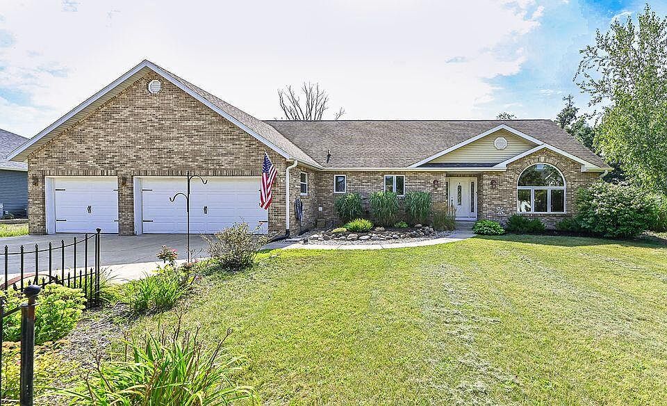 Beautiful Brick 3 BR, 2 Full Bath Ranch w/3 car garage on a wooded half acre lot. Spacious open concept floorplan, featuring a large kitchen w/maple cabinets, Corian tops, breakfast bar, ceramic tile, updated lighting & flooring. This lovely home also features a sprawling great room w/vaulted ceilings and a huge dining room/living room, plus a main floor laundry, separate mudroom and a primary bedroom suite w/large bath and walk-in closet. A huge basement with an egress window is ready for your finishing ideas and has extra tall ceilings plus is stubbed for a future bath. Relax and enjoy the outdoors on the composite deck while overlooking the wooded back yard. Upfront you'll find a large driveway with lots of space that leads to a 3-car finished garage!