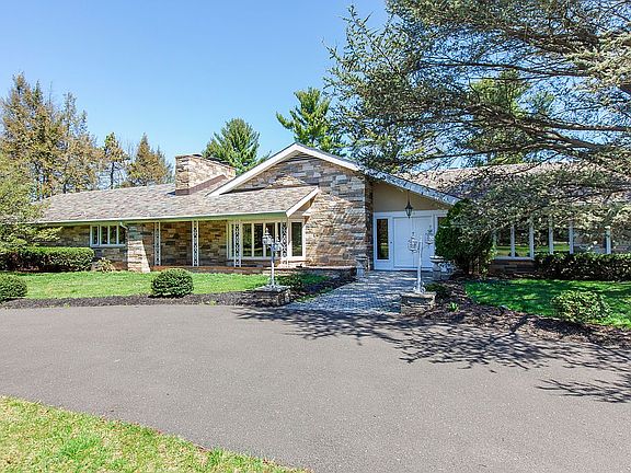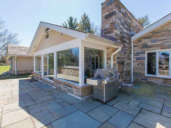 5123 Square Feet (above grade) Expanded with 600 sq ft Master Bedroom and Luxurious Master Bath addition and completely Updated Rancher. This Exquisite Custom, 1 floor living home, built by John Regler, will amaze any buyer with its sprawling and flowing floor plan with sun-filled rooms and full stone wall fireplaces (3) thru out. The Kitchen was remodeled with custom cabinets, tile back splash, top-of-the-line stainless steel appliances, with a large eat-in area. The Formal Living Room with custom in-lay wood flooring, stone wall and wood burning fireplace will greet your guests upon entering the double doors off the grand circular driveway. The Dining Room was taken out of the European magazines with custom in-lay wood flooring similar to that found in the Hermitage Museum. Entertain your guests in the Great Room with bamboo flooring, Domed Ceiling and another awesome custom stone walled, wood burning, fireplace with separate seating areas and wall of windows and sliding doors to the blue stone patio. Work from home in the study having custom built shelving and another full wall stone fireplace. The original master bedroom of the home is now the guest suit with remodeled full bath. The current Master suit is an addition to the home that boasts cathedral ceiling, walk-in closet with California closet organizers, wood flooring, a custom Lutron shade and curtain control, and a master suit bath with custom marble tile heated floors, marble tile walls, deep soaking tub, double sinks and seamless glass walk in shower. This night time retreat has full wall of windows over-looking the gardens and a door and walk way to the rear patio. Two more generous size bedrooms and updated full bath can't be missed along with attention to detail with custom hardware from Europe and solid wood doors. The Sun Room, so to speak room, is one of the connecting rooms, from the inside of the home, thru sliding doors, to the expansive NY Bluestone patio extending the length of the stone home and able to accommodate 200 people with views of the 1.4 acres of land and in-ground pool. The pool area has a Cabana and Dressing Room as well. 8 zone heating, 2 zone cooling and a lot of classic beauty reside in this home, so should You!