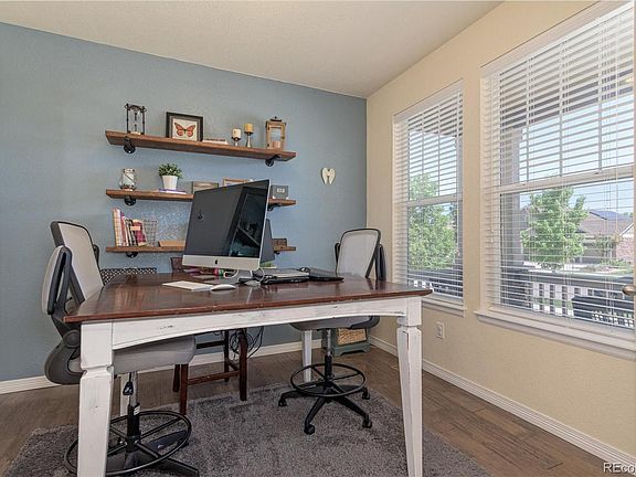 This beautiful move in ready home features 4 bedrooms and 3 full bathrooms upstairs, plus a main floor study and a desirable lot! Welcome inside to wide plank engineered wood flooring that extends through the main level! Open floorplan hosts a generously sized family room that features a corner gas fireplace with stacked stone detail and convenient powder bath nearby. Richly appointed kitchen boasts abundant espresso cabinets with 42" uppers and a large island that is perfect for meal prep. Slab granite countertops coordinate perfectly with the subway tile backsplash, plus there is a walk in pantry for additional storage. Stainless steel appliances include gas range, microwave, dishwasher and refrigerator. Imagine hosting meals in the dining area with access to the manicured backyard with privacy fence and stamped concrete patio, perfect for your outdoor living space where you will enjoy not having the neighbor's house directly behind! Note the stamped concrete sidewalk and a fenced in dog run with turf. Upstairs master suite includes a private five piece bath with tile floors and slab granite countertops, plus a large walk-in closet. Two secondary bedrooms share a full jack and jill bath and bedroom 4 is an ensuite with private full bath. Two car insulated garage, 50 gallon water heater and the unfinished basement has room to expand! Located in The Conservatory with community pool, parks and trails!