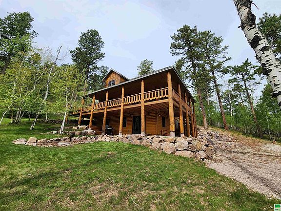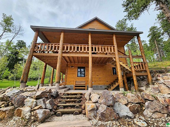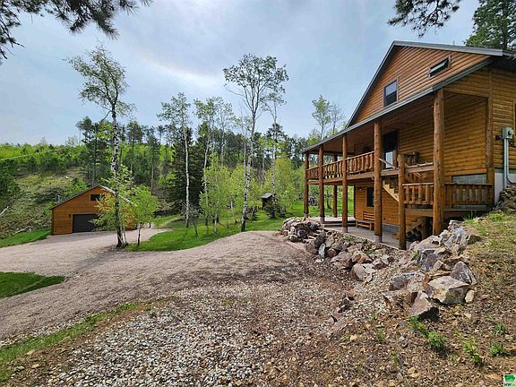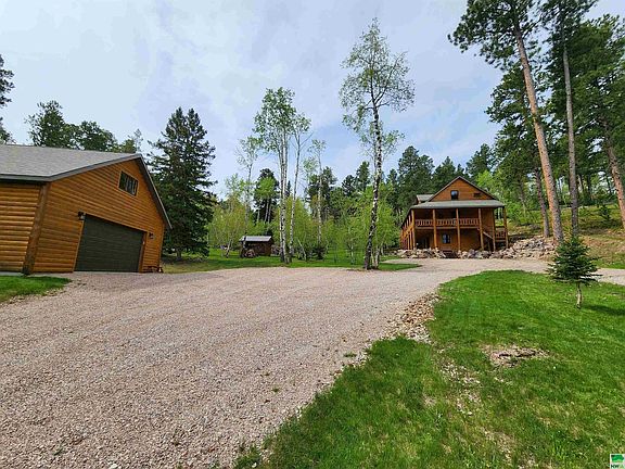 Gorgeous cabin located in the Black Hills of South Dakota. Enjoy the views from the wrap around deck or one of the patios. Once inside the cabin you're welcomed into the open living space with vaulted living room ceiling, hardwood floors, large windows, kitchen and dining area. You will also find a breakfast bar, a large walk in pantry, main floor laundry, and heated bathroom floors. The detached 2 car garage has 200amp electrical service plus heat/AC. And there is a finished bunkhouse above the garage for additional sleeping space. The 4 bedrooms and 2.5 bathrooms make this cabin great for any gathering. You can explore the 4+ acres that feature natural seasonal springs, Elk, Turkey and other wildlife.