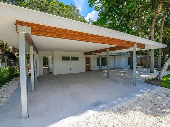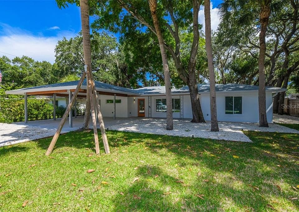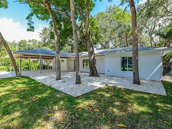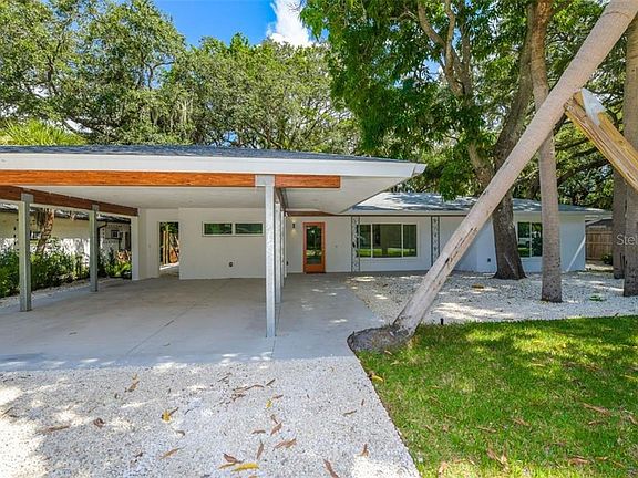 One or more photo(s) has been virtually staged. Looking for a Mid Century Modern. Move this house to the top of your list of must see homes. Renovations have just been completed. The home is situated on an oversized lot in the coveted Arlington Park neighborhood. This 3 bedroom, 3 bath home has been completely transformed. The exterior has mature landscaping and drought resistant plantings, a new carport and driveway, new rear patio, lighted covered walkway to main entry, and even a sand finish on stucco. The back yard has mature oak trees that the sun filters through, room for a pool and there is even an outdoor shower. All windows and doors are impact resistant. The terrazzo has been restored where it could be and added where it did not exist. The galley kitchen has modern grey cabinetry with numerous drawers, a pantry with a prep station, stainless steel appliances and a natural gas stove. Quartz counters compliment the terrazzo. The kitchen is open to both the living room and dining rooms. They are flooded with natural light and have incredible connections to the outdoor space. All walls are level 4 drywall, baseboards are modern, all interior doors are solid wood with a natural finish. There are Led lights in ceilings, a wooden accent beam is structural but also serves as a design element. The master bedroom opens to its own terrace, its bath has a double trough sink, a large walk-in shower, the closet system is designed to maximize the space, the closet doors are natural wood and add a unique design element to the room. All closet doors feature a pivot hinge to maximize the space. There are 2 additional bedrooms and 2 additional full baths. One bedroom could be used a home office or separate den. The laundry is conveniently situated in the residence. The home has a new air conditioning system including ductwork, updated plumbing and electric, new insulation and more. It is almost a new residence most interior walls were removed and reconfigured.