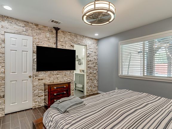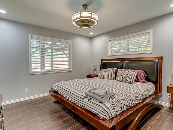 The primary bedroom has a king-sized bed.