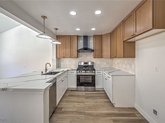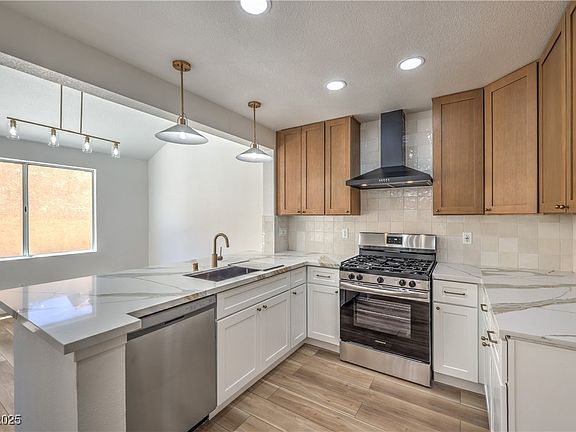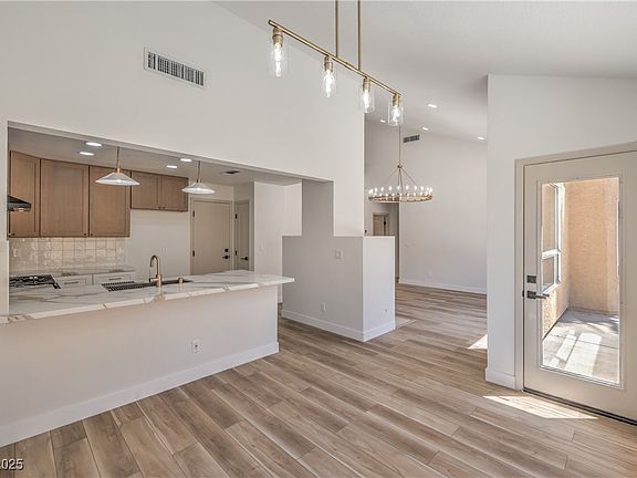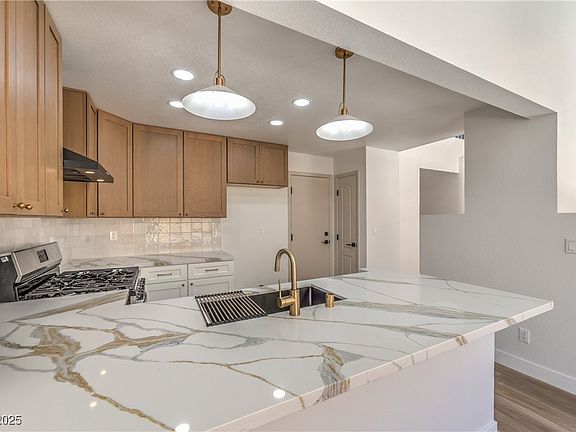 Welcome to this beautifully remodeled two-story home located in the highly desirable Summerlin North community. Just under 10 minutes from Boca Park, you'll enjoy easy access to shopping, dining, and entertainment. Inside, you'll find vaulted ceilings, stylish laminate flooring, plush carpet, washer/dryer hookup, and a custom-tiled fireplace. Windows bring in plenty of natural light, and the spacious upstairs loft offers flexible space for a home office, media room, or lounge area. The kitchen features custom cabinetry with gold hardware, a modern tiled backsplash, recessed lighting, sleek countertops, a breakfast bar with seating, and stainless steel appliances. Bathrooms have been updated with tiled showers, rainfall shower heads, separate tub in primary, upgraded dual vanities, framed mirrors, and contemporary lighting.