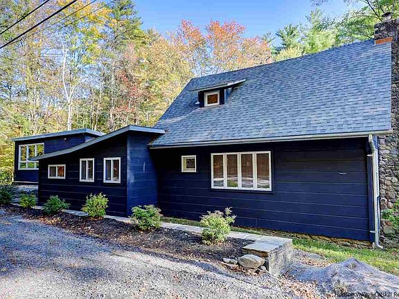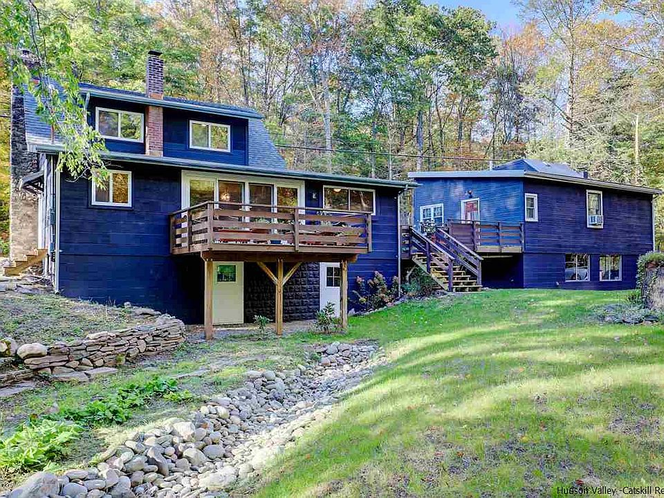 Come see the amazing transformation to this special Woodstock property! Beautifully presented, this quintessential Woodstock home is move-in ready. From the new master bath to the exterior lighting and the cozy stone fireplace with a new chimney liner and wood stove, everything is ready for you to simply unpack and relax. The spacious home offers three bedrooms and two full baths, including an upstairs master bedroom suite and an additional den/office. Hardwood floors flow throughout, there are beautiful beamed ceilings and new sliding doors in the dining room lead out to the gorgeous deck with views over the private yard. The living room is spacious and inviting while the office/den takes in views over the back yard. A main floor laundry ensures complete convenience while the kitchen is equipped with updated retro appliances and charming brick floor. There is also a huge studio/guest house with hardwood floors, a full bath and a full kitchen, high vaulted ceiling, perfect for guests, yoga, home office or gym, painting studio, music studio, etc. If you need even more living space, you can finish the lower level of the guest house. With large windows already in place, there's plenty of natural light for an additional workshop or studio. The yard has been beautifully landscaped and graded and proper drainage has been put in. There's ample space for parking while a host of updates include a new electric panel, new roof and gutters, brand new septic system, new water system, new filtration system, new sliding glass doors, 2 new renovated bathrooms, installed new exterior lighting, and new interior lighting fixtures. House has been completely painted inside and outside. A picturesque stream borders the private backyard. This unique home is located within walking distance of the historic town of Woodstock. Those who like to get out and about will love the easy access to restaurants, shopping, concerts and the theater while hiking trails are close by for the nature lover.