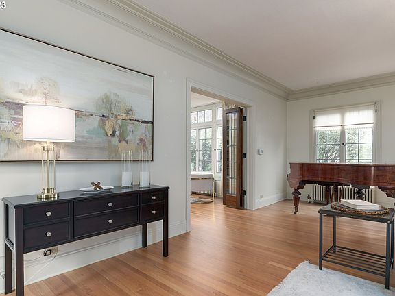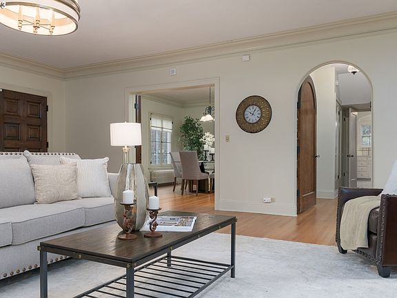 This 2 story, 3527 sf master piece is sure to take your breath away. A beautiful oversized corner lot with white fencing creates a nice perimeter that contains the glass greenhouse (recently rebuilt) and gazebo that have been standing for years. All of this is bordered by mature gardens and prize roses. The elegant front entry takes you right into the center of this home. Here you will find pristine hardwood floors, tall ceilings, wall sconces, crown mouldings, and a custom Batchelder-tiled wood burning fireplace. Working radiators are reminiscent of days gone by, however, there are 2 heat pumps for quick and efficient heat and A/C. You can't miss noticing the incredible staircase, smooth railing, and the way the space is bathed in light from the trio of arched windows overlooking the garden. This treasure deposits you on the 2nd floor where you have 3 bedrooms,(could be 4), a full bath and an office space. Gorgeous, solid wood doors, leaded windows, a library with floor to ceiling shelving and a built-in niche here and there, create the magic. The kitchen sink is an original farmhouse style, white cabinets, ss appliances, cooktop and double ovens. A built-in desk for small tasks makes sense. Formal dining, a breakfast room, and laundry on the main complete this fantastic floor plan. A primary bedroom on the main is tucked away in the SE corner for maximum privacy. There is an attached garage, lower level for storage, workshop etc. Very close to all SE schools and only a few blocks from the UO. The nearby world-renowned Hayward Field makes walking to track meets a given. This home is being offered for only the 3rd time in nearly a century. (There is an additional 1120 sq in the lower level that is not included in the 3527 sf). Appointments only.