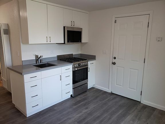 ALL UTILITIES INCLUDED with rent. Brand new apartment with new everything: flooring and custom kitchenette and bathroom with build in cabinets to utilize the space as best as possible. Kitchenette: Gas stove(4 burner) and oven, microwave, and sink all with stainless steel finish. Grey quartz counter-tops custom made to make as much counter space as possible, also there are lights over counter-tops so easy to see when cooking. Stainless steel refrigerator with freezer on top. LOTS of cabinets and drawers to store what ever you need. Table with two chairs, table folds out so it can be made longer to fit more people. Big window with good natural light Bathroom: Stand up Shower with white quartz walls and built in cabinets with excellent storage space. Fan with timer switch to help conserve energy and keep moisture out. Bedroom: Spacious room and custom built closet with shelf and extra cloths rack to handle more cloths easier. We have a queen-size bed frame. Big window for lots of natural light. Internet is included. Backyard: Small and simple with a couple raised garden beds. Space in beds could be made available if you would like to grow some veggies. Laundry: In back room of main house and can be available for use on certain days. Parking: On Street Public transportation: 8 minute WALK to Bart and bus station around the corner Food: There is a really good burrito shop, gas station, corner store, and small market all within a 5 minute walk. Amenities are included in rental price, including internet and laundry. Asking $1,800 for one person and $1,950 for two. No more than two people. Security deposit will be last months rent. Year long lease(negotiable) with a 5% increase if you choose to stay another year. We own a cat so may be tough if you have a dog or cat but please ask, willing to accommodate though.