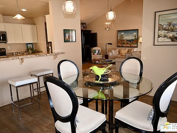 Completely remodeled and upgraded. Engineered wood flooring throughout public spaces. Soft, plush carpet in both bedrooms. Living room features high vaulted ceilings, a sparkly glass chandelier, a fireplace worthy of the term focal point. A large window for natural light with window covering. Dining room has a sightline to the living room, dining bar and kitchen with direct access to the one car garage. Kitchen is topped with a warm golden granite, refrigerator, cooking range, microwave and dishwasher included. Take your meals and beverages outside through the kitchens sliding glass door to the shaded, private, covered patio surrounded by foliage. The generously sized primary bedroom, with walk in closet, exterior access to community pool just steps away. Primary bath features a dual sink vanity, shower over tub has mirrored glass to reflect light and greenery from the outside access to the private patio. Bedroom two provides built in storage shelves for all your books and mementos, a tall window with covering for natural light and privacy control. Bath two is tiled in a classic black and white pattern in the step in shower. Sunshine Villas has installed all new efficient desert landscaping on the streetside of the community! It looks good now, It will be gorgeous when matured. Greenspace grass will remain in walkways and pool areas. The new look coordinates beautifully with this lovely, light and airy condo. Come and experience this ready to move in and enjoy 2 bed 2 bath home.