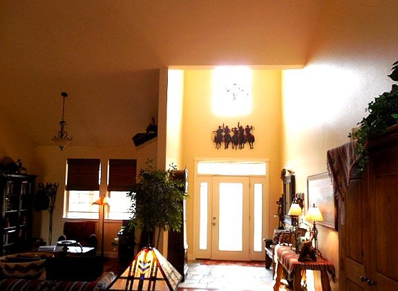 - Breakfast Bar, Master Downstairs, Pantry, Shower/Tub Combo, Tile Counters, Double Vanity, Walk-In Closet(s), Ceiling Fan(s), Enclosed Toilet(s), Kitchen Island, Soaking Tub, Tile Shower, Vaulted Ceiling(s), Open Floorplan, Wired for Sound