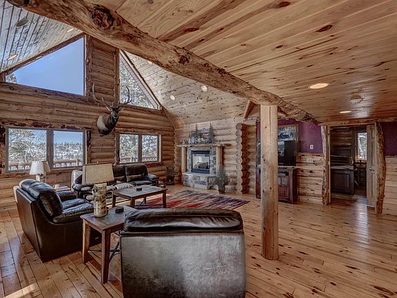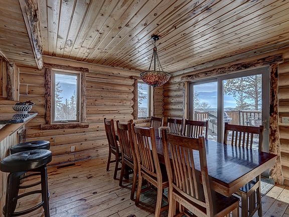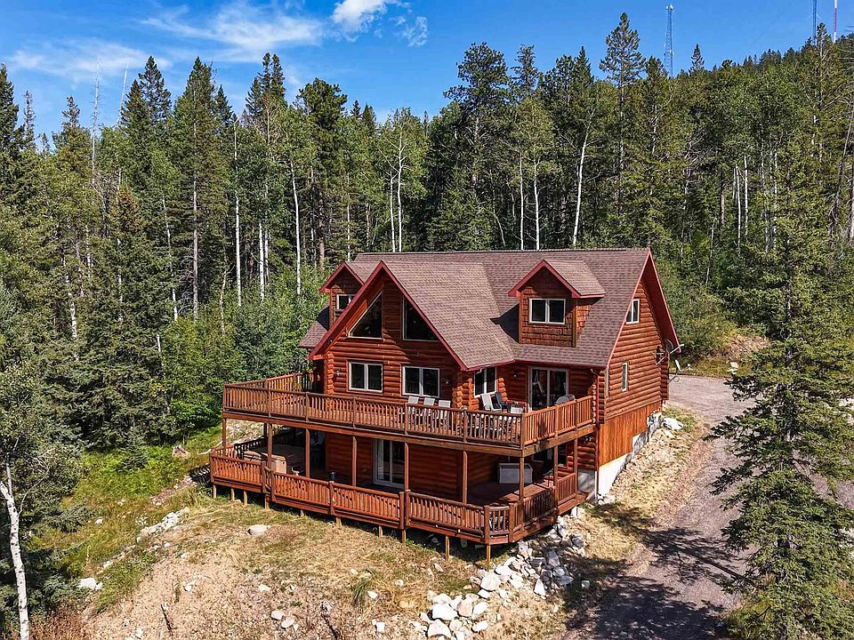 Here's a 5 bedroom, 4.5 bath, custom built log home located just behind Terry Peak on a .56 ac lot backing USFS land. On the main level the home features a spacious kitchen and dining area complete with stainless appliances including wine fridge, custom cabinetry, and quartz countertops. The expansive great room has a vaulted ceiling, cozy fireplace, and strategically placed windows to allow for plenty of light and outdoor views. Off the great room is the primary bedroom with its own bath including double vanity, jetted tub, and separate shower. Both the dining area and master bedroom accesses the huge wrap around deck with magnificent views of Spearfish Canyon and all the Hills has to offer. The loft has 2 good sized bedrooms, sitting area, and a bath. But the fun is in the basement, with 2 bedrooms, wet bar area, family room with fireplace, gaming areas, and, of course, a hot tub on the wrap-around lower deck. Plus, there's 2 laundry rooms, up and down. Make this one Yours Today!