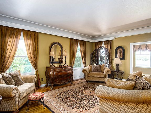 With its spacious layout, this vintage home effortlessly accommodates the needs of modern living. Discover a lovely updated kitchen, large formal dining room, breakfast/coffee nook, entry room with stained glass side-lights, basement, formal living room and cozy den with brick fireplace and large floor to wall windows. The 2 upstairs bedrooms with original hardwood floors have walk-in closets and spectacular views. The master suite with sitting room has a full bath with freestanding tub and separate shower. The 4th bedroom is currently being used as an office. Retreat to the serene courtyard with gorgeous, mature landscaping and covered patio room which could easily be an outdoor kitchen.