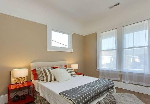 Must see! Stunning, large 3 bedroom, 2 bath. Top floor of duplex. 8 foot ceilings. Tons of light. Master suite. Washer/dryer in unit. Stainless steel appliances/hardwood. Carpet in 2 bedrooms. Gorgeous, large, mature yard. Deck off master bedroom. Walk to 4th street shopping/restaurants. Down the street from Rosa Parks elementary. 1 mile to North Berkeley Bart. Very large storage (equivalent to 2 car garage). Off street parking. $4700 mo/+ utilities