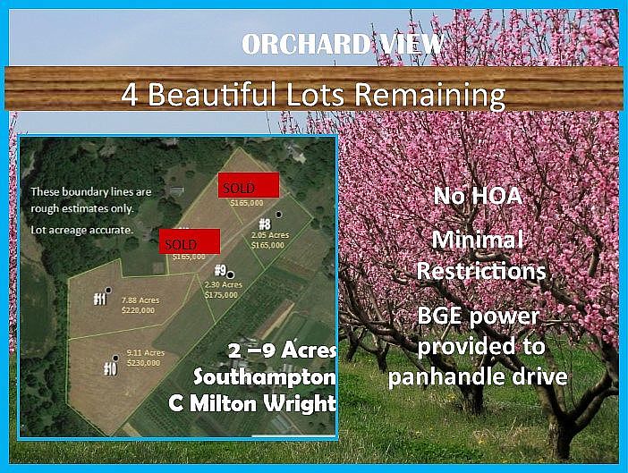 This is Lot #9 with 2.30 Acres. Beautiful setting for a forever home. Come and walk the properties. No appointment necessary. txt 443-417-5135 for more information. Need a Construction Loan? We have a family contact to share. Lots 8,10,11,available