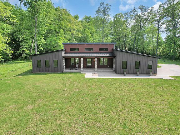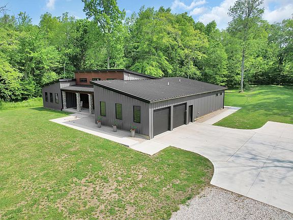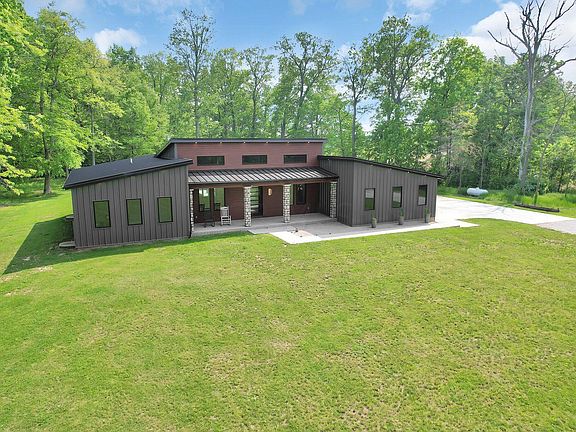 Private retreat nestled in the woods on seven acres. This one of a kind totally custom home features a large Chef's kitchen with custom cabinets, a 14 foot Quartzite island, 5 burner gas cooktop, double ovens, a wine refrigerator and a large walk-in pantry. Enjoy views of the pool and woods through the wall of glass sliders in the great room. The spacious Owner's Suite boasts a large walk-in shower, freestanding tub, walk-in custom closet and glass sliders out to the pool deck. Beautiful inground pool and covered patio/outside entertaining area. There are also 3 other bedrooms, a full bathroom, full basement with 2 egress windows, a large laundry/mud room with a built-in drop zone and dog wash station. There is plenty of room in the XL 2 car garage, large pole barn and camper barn.