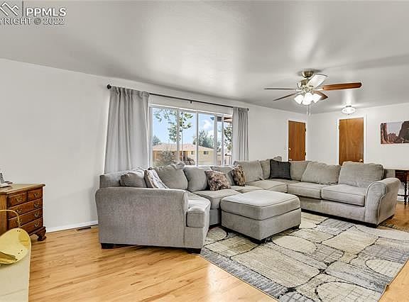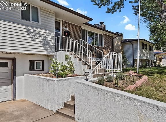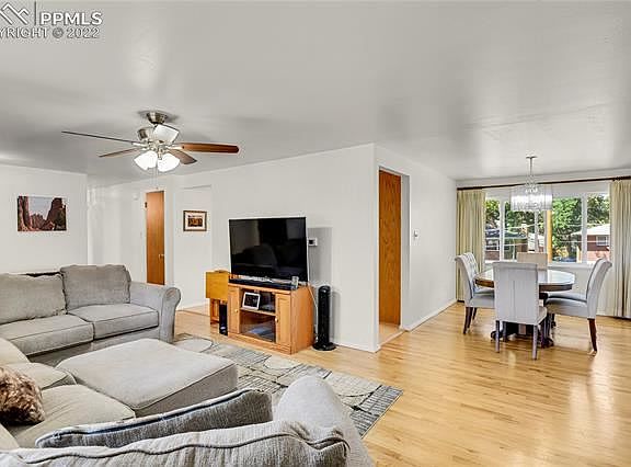 Spacious and sunny raised rancher w/4 beds and 2 baths, Oversized 2 car garage, 2 fireplaces and an awesome deck with tons of natural light. Beautiful wood floors throughout the main level. Large living room boasts a large picture window and wood burning fireplace creating cozy Colorado nights. Off the living room is the separate dining area with a dainty chandelier and large windows overlooking the backyard and access to the kitchen. Down the main hall are 3 bedrooms. Very large master bedroom! Full big bathroom. The garden level basement of this home has a nice sized family room with all new carpet and brick fireplace, 4th bedroom, 3/4 bath, laundry room and walks out to the oversized 2car garage with ample storage and a workbench. You will fall in love with the park-like rear yard with lush grassy lawn, garden areas, paths and mature trees. There is also a big upper deck with a new awning providing shade for dinner time! The lower level partially covered patio - perfect for entertaining or relaxing. This home is impeccably maintained. There is central AC and newer updated vinyl windows throughout! Great views from the rear deck! Attached side storage for your lawn and garden tools. Centrally located 2 blocks from Palmer Park Regional Park and trail head (voted best urban park, 2017) and minutes from schools, shopping, and entertainment.