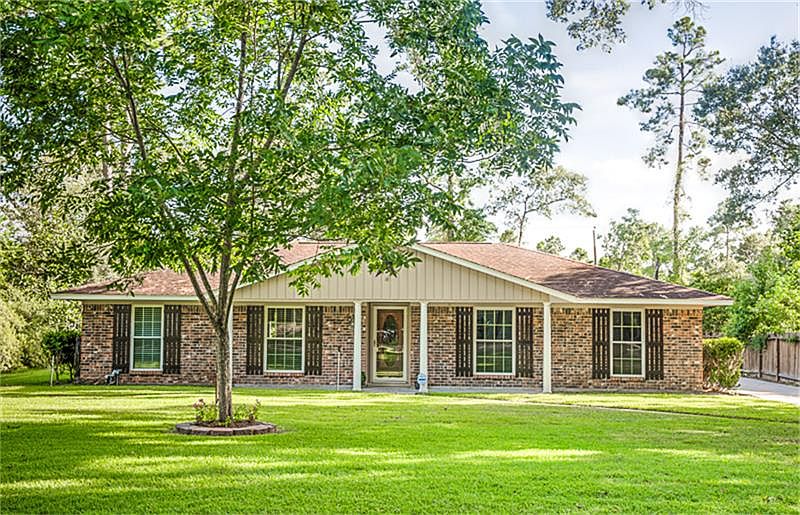 Lovely one story home on large 16,000 sq ft lot features 3 bedrooms, 2 baths, both formals plus a 30' X 40' shop! Features include double paned windows throughout home, laminate wood flooring in all living areas & bedrooms-no carpet!, upgraded light fixtures, spacious bedrooms, ceiling fans in all rooms & more. Fenced backyard & covered back patio. The shop has a covered work area at entrance, water & electricity. Quiet, wooded subdivision is conveniently located minutes from I 45. A must see!