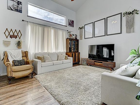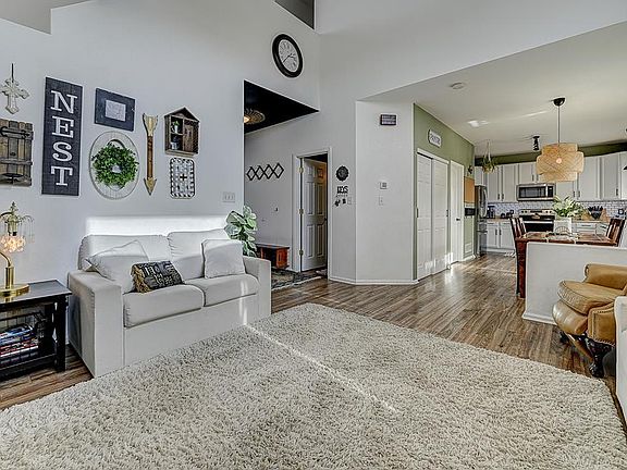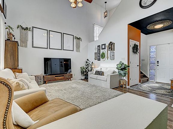 This home is move in ready and looking for its next owner! An adorable front porch greets you before stepping inside to a tiled entryway with coat closet. The main level features wood laminate throughout, a half bath, large kitchen/dining area, and a spacious living room with high ceilings and tons of natural light. Tasteful updates galore from flooring to lighting to accent walls, as well as a newly built deck off the main level. Upstairs you'll find three bedrooms including the master with attached bath. At the end of the day, retreat to the huge basement family room for a movie night. Fully fenced backyard with additional parking/drive through gate on the side. Washer and dryer included!