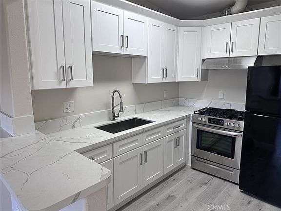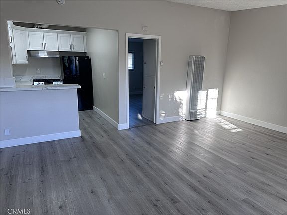 Beautifully upgraded 1 bedroom 1 bath upstairs end unit. Large, open living room, recessed lighting, laminate flooring throughout. Kitchen is nicely updated with stainless steel 6 burner gas stove, stone countertops, new kitchen cabinets with plenty of space, refrigerator included. Nice sized bedroom with cedar closet and private bath. Wall unit A/C and ceiling fan in the living room. Community laundry room onsite. One parking space in a shared garage. Water included in rent, tenant responsible for trash, gas & electric. Walking distance to Anaheim Town Square Marketplace - featuring dining and shopping options; Target, Ross, Northgate, Burlington, Gold's Gym, Pep Boys and more! Close to the 57 and 91 freeways and all local attractions.