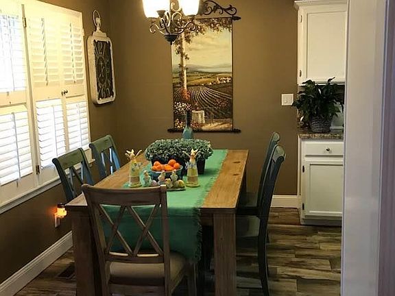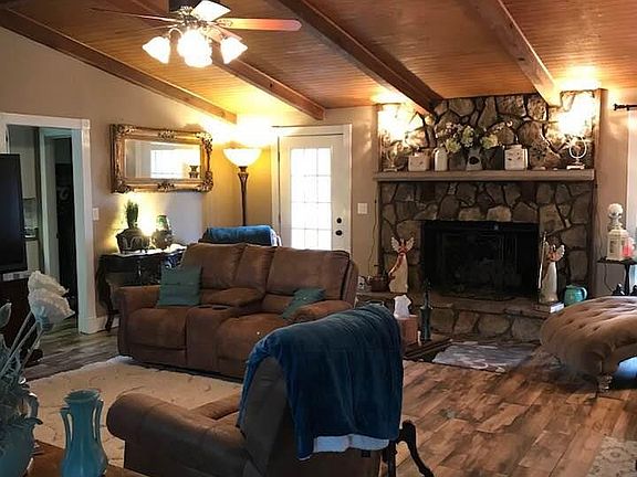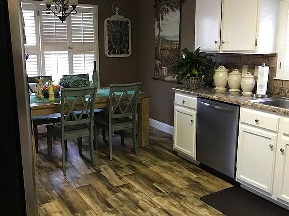 Beautiful home like new. Den has vaulted ceiling with rock fireplace with new gas logs. Large eat-in kitchen with new stainless steel appliances. New ceramic tile wood look floor in den, kitchen and laundry. New backsplash and counter tops. Neutral colors throughout. Hall has been completely updated. New metal roof. Lots of parking space. Corner lot with fenced back yard and large storage building. Maintenance free.
