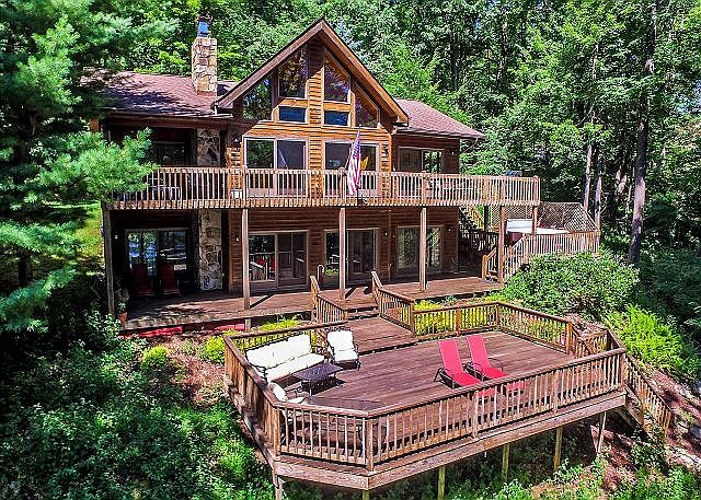 This lakefront home offers 235' of lakefront! Offering two tier decking and a hot tub allowing you to enjoy the beautiful views and entertain on any level of this home. Open floor plan, 4 bedrooms (two masters), large great room with a stone wood burning fireplace and an abundance of large windows and doors to allow you to enjoy Deep Creek Lake from almost every room. Est. rental "Hemlock Hill".