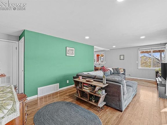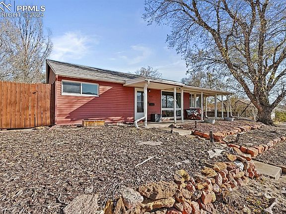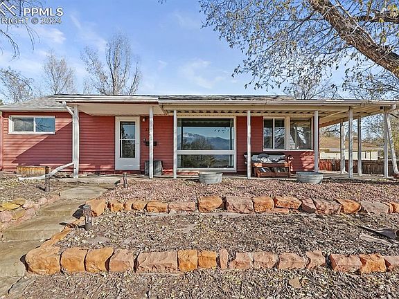 Classic ranch-style home, where stunning mountain views and thoughtful updates come together. The beautifully landscaped front yard invites you to relax on the expansive 31-foot covered front porch, offering jaw-dropping views of Pikes Peak that feel like it’s right on your doorstep. Step inside to discover beautiful hardwood floors flowing throughout the living room and bedrooms. The living room is bathed in natural light, thanks to a floor-to-ceiling front window that perfectly frames the Front Range. Eat-in kitchen has been UPDATED with granite countertops, a NEW microwave (2024), an UPGRADED refrigerator, and a modern sink and faucet. The laundry room provides convenient access to the fully fenced backyard, a flagstone patio, and large storage closets on the carport. This home features two spacious bedrooms, including one that’s over 23 feet long, with walk-in closet, and an UPDATED full bathroom. 2024 New water heater and furnace. Plus: Air conditioning, NEWER 6-panel doors, faux wood blinds, ceiling fans, UPDATED vinyl windows, a carport, and alleyway access for added convenience. Centrally located, this property offers proximity to UCCS, downtown, and a wide array of shopping, dining, and entertainment options, plus super close to Rock Island Trail making it both comfortable and convenient. Don’t miss your chance to call this beautiful home with breathtaking views your own!