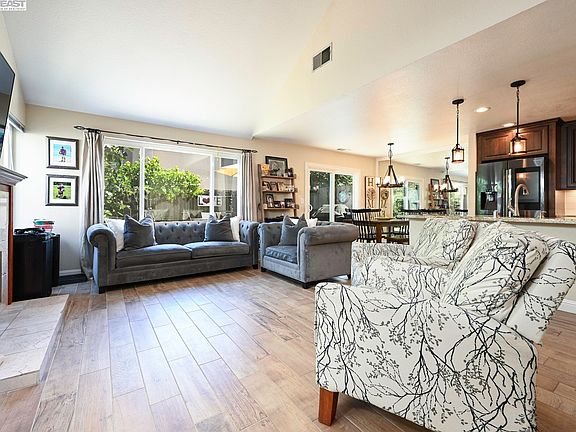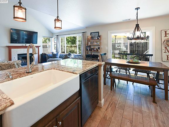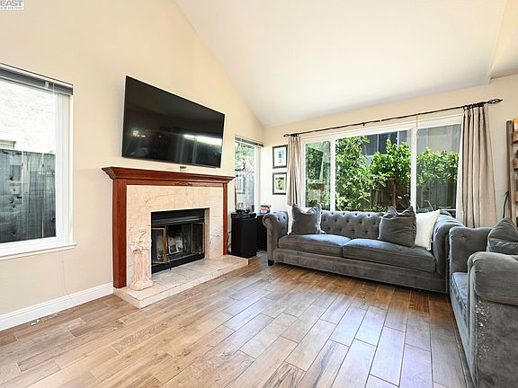 Discover the allure of this charming duet. With a spacious 2508 sqft canvas, this stunning home is flooded with natural light, enhanced by vaulted ceilings and a cozy fireplace. Enjoy the comfort and convenience of 3 bedrooms, 2.5 bathrooms, and tiled floors throughout. The chef's kitchen is perfect for culinary endeavors, while the stone countertops and dark brown cabinets add sophistication. Outside, a beautiful lawn and built-in garage provide outdoor space and security. Conveniently located near shops, cafes, and top-rated schools. Explore the best of indoor and outdoor living here. There are Several Fruit trees peach, fig, plumb, grape, olive. New Front Lawn with sprinklers. Touch faucets, wifi garage, wifi fridge. Soft closing drawers in the kitchen. Roll outs in the cabinets. The flooring is tile on the first floor. Carpet on the 2nd floor.