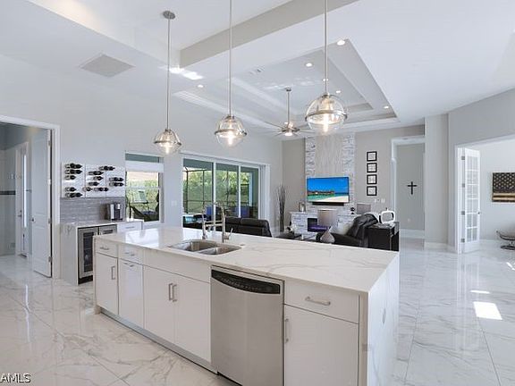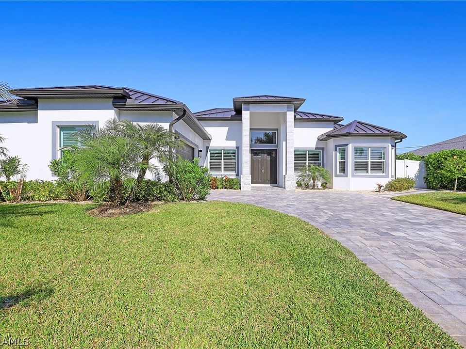 Amazing Newer Home located in one of the Best Locations in Cape Coral. Close to Cape Harbour and more. Hurricane Impact Windows, and 8' Tall Impact Sliders, Assessments are Paid in Full, Standing seam metal Roof, paver driveway to the side loader garage and on both sides of the house and on to back lanai and surrounding pool and tanning area. 8' Tall Wood double door entryway with a transom window over. The entire home has white 24" Tile Flooring and 8' Tall interior doors, Crown Molding, 5" Baseboard molding. Almost all windows have custom wood white plantation shutters. On the sliders there are custom accordion fabric privacy shades. There is a custom wall of tile and a built in designer wall fireplace in the Great Room. The kitchen offers a huge Quartz countertop Island with Quartz waterfall and European white cabinetry. 3 Full Baths and a shower head by the pool. New outside kitchen island with granite countertops and stainless drawers for organization. There is also a built in Barbeque, sink, Refrigerator and prep area. Oversized pool and large Tanning area. Must be seen to be appreciated