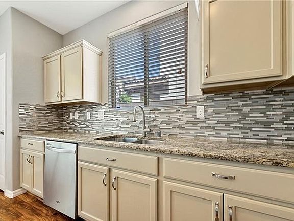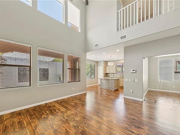 SOLAR powered Summerlin house will significantly reduce your monthly energy bill. Bright and spacious 3 bedrooms + OFFICE +3 bathrooms. Includes: DEN/OFFICE w glass door enclosure, open floor plan w soaring ceilings, kitchen granite counters, beautiful backsplash, all stainless steel appliances, rain shower primary bath with his-and-her vanities and closets, hardwood flooring throughout, tankless water heater, solar panels, covered backyard w warmly appointed lighting, plus mini dog area in backyard. 2-car garage w storage. Location: WALK to Downtown Summerlin, shopping, restaurants, Red Rock Casino, close to I- 215, park, playground, tennis, swimming pool in the community.