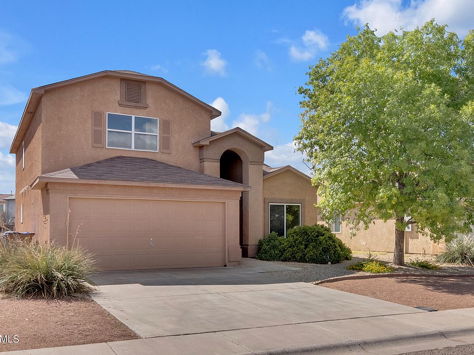 In a prime Las Cruces location, this home boasts standout curb appeal and has been beautifully maintained. Step into the living room with soaring vaulted ceilings, wood laminate flooring, upgraded lighting, and a cozy gas fireplace. The kitchen offers upgraded appliances, stylish hardware, a pantry, and a clear view into the living room. A separate dining room provides the perfect setting for entertaining, while the upgraded staircase railing adds elegance. The chic master bedroom and a stylish powder room are conveniently located on the first floor. Upstairs, you'll find a versatile room for multiple uses, an office nook, two more bedrooms, and a beautiful bath. The guest room enjoys charming views of the Organ Mountains. Outside, the nicely landscaped yards with shade trees and low-maintenance backyard feature a covered patio and peaceful views, with no neighbors behind. Additional highlights include refrigerated air, large closets, skylights, and new carpets.