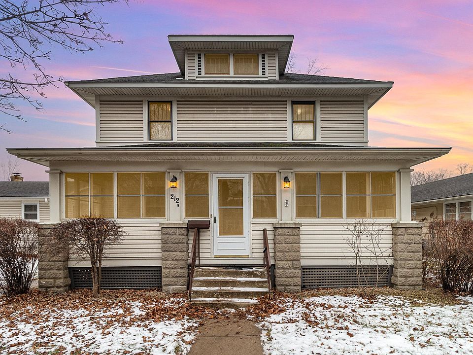 There is a delightful 3-season porch in the front. Plus a lovely yard with a HUGE detached shop and a 3.5 car garage featuring alley access and in-floor heating.