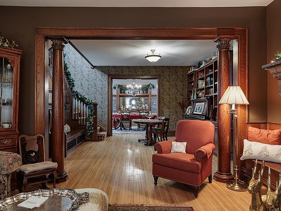 As you step through the front door, you're greeted by the warm embrace of meticulously maintained hardwood floors that lead you through the home's four levels, boasting elegant chandeliers, gorgeous woodwork and wine cellar. The charm extends beyond the interiors to the lush perennial gardens that surround the property, creating a serene and picturesque ambiance. The carriage house, with its own unique character, presents endless possibilities. Explore the potential for additional suites, private studio apartments, or guest retreat. Each upper unit boasts whirlpool rooms and fireplaces and private laundry hookups. This is a legacy property with endless opportunity!